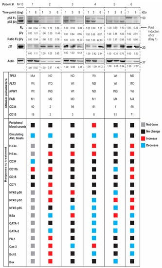 - Ånensen, N.; Hjelle, S.M.; Van Belle, W.; Haaland, I.; Silden, E.; Bourdon, J.-C.; Hovland, R.; Taskén, K.; Knappskog, S.; Lonning, P.E.; et al. Correlation analysis of p53 protein isoforms with NPM1/FLT3 mutations and therapy response in acute myeloid leukemia. Oncogene 2011, 31, 1533–1545. [Google Scholar] [CrossRef] [PubMed]