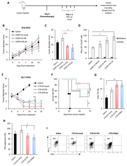 Since previous data from our group demonstrated a synergistic anticancer effect of parenteral IFN-I and some anticancer drugs, such as cyclophosphamide (CTX), cis-diamminedichloroplatinum (II) (CDDP) and epigenetic compounds [29,46,50,51], we aimed to evaluate whether Sl-IFN is also effective when combined with these drugs in tumor-bearing mice. Thus, C57Bl/6 female mice were implanted subcutaneously (s.c.) in the right flank with either B16-OVA melanoma cells or with EG.7-OVA lymphoma cells. When tumor masses reached the mean diameter of 2 ± 1 mm and 9 ± 2 mm respectively, mice were injected i.p. with a single dose of CDDP or CTX followed, one day apart, by four daily administrations of Sl-IFN or the same volume of a mock preparation (Sl-mock) as a control. Another group of mice received four peritumoral injections of IFN-I (IFNpti) one day after chemotherapy (Figure 3A), as previously described [29]. As expected, treatment with CDDP had negligible effects on the growth of melanoma tumors (Figure 3B,C) [52,53], while CTX induced a transient reduction of tumor size in EG.7-OVA-implanted mice, leading to cure in 50% of animals (Figure 3E,F). Interestingly, the addition of Sl-IFN to chemotherapy further reduced tumor size and improved mice survival similarly to what was observed in the groups treated with chemotherapy and IFNpti in both tumor models (Figure 3B,E,F). Furthermore, Sl-IFN and IFNpti elicited a slight yet comparable increase in antigen-specific immune responses in the spleen of CDDP-treated B16-bearing mice (Figure 3D) and the accrual of comparable levels of CD3+ TIL in the tumor tissue of CTX-treated mice implanted with EG.7-OVA (Figure 3G). Most importantly, the addition of IFN-I decreased PD1 expression on tumor-infiltrating CD8+ T (Figure 3H,I), thus suggesting that these cells are less susceptible to PD1-PDL-axis-related immune suppression. Altogether, these data support the concept that Sl-IFN and IFNpti are equally efficient at eliciting antitumor responses in combination with chemotherapy in melanoma and lymphoma models.