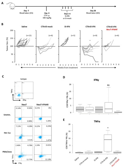 Therapeutic effect of combined CTX/Sl-IFN treatment in NeuT transgenic mice. (A) Schematic representation of the experimental design. (B) Percentage tumor size in NeuT 129sv mice treated with CTX and Sl-mock (n = 6) or with Sl-IFN (n = 5) or with a combination of CTX and Sl-IFN (n = 9) according to the schedule depicted above. One group of mice was treated with Saline as control (n = 15) and one group of NeuT-IFNAR was treated with CTX + Sl-IFN (n = 6) as specificity control. * p < 0.05 (only at week 3). (C) Representative dot plots showing the percentage of IFNγ+ and/or TNFα+ cells in CD3+ CD8+ T-gated cells from NeuT and NeuT-IFNAR mice treated with CTX and Sl-IFN. Blood samples were collected 28 days after treatment. Unstimulated, Her-2/Neu peptide-stimulated and PMA/Iono-stimulated PBL samples were stained and analyzed as described in Section 2. One representative dot plot from an isotype-stained control is also shown. (D) Box-Whisker plots depicting the percentage of IFNγ+CD8+ T lymphocytes and (E) the percentage of TNFα+CD8+T lymphocytes in the blood of mice treated as indicated after stimulation with Her-2/Neu peptide (435–443). Center lines show the medians; box limits indicate the 25th and 75th percentiles as determined by R software; whiskers extend 1.5 times the interquartile range from the 25th and 75th percentiles (n = 5).