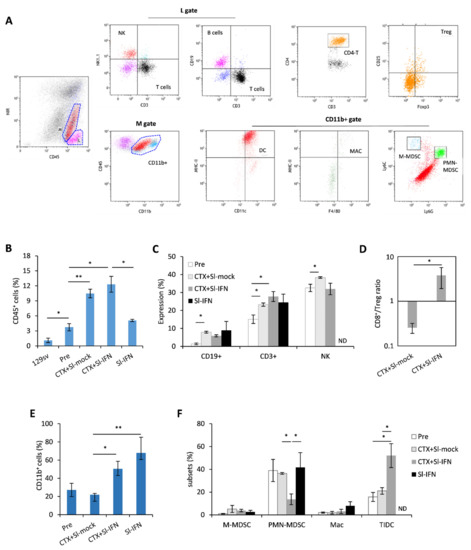 Analysis of leucocyte subsets in the tumor mass 22 days after treatment. (A) Representative dot plots of the gating strategy for lymphoid and myeloid subsets in tumor cell suspensions. (B) Percentage of CD45+ tumor-infiltrating cells in the tumor mass of NeuT 129sv mice treated with CTX and Sl-mock or Sl-IFN or with Sl-IFN alone as detailed in Section 2 (n = 4). (C) Percentage of the indicated lymphoid subsets in the tumor mass after gating on CD45+ SSClo cells. (D) CD8+ T/Treg ratio in the tumor. (E) Percentage of CD11b+ after gating on viable CD45+ cells, and of (F) tumor-infiltrating myeloid cell subsets. Myeloid subsets percentage is calculated after gating on CD11b+ cells. * p < 0.05; ** p < 0.01. ND, Not determined.