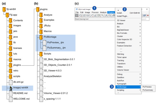 Fiji is a distribution of ImageJ [1,2] and can be freely downloaded from the internet (https://imagej.net/Fiji/Download, accessed latest on 6 April 2021). Please download and save the zip folder to your computer hard drive and extract all files. Note that you do not need to install the program or have administrator rights to use it. To start Fiji, simply open the extracted folder (fiji-win64\Fiji.app) and double-click on the ImageJ-win64.exe file (Figure 1a). Note that PicPreview and PicSummary were developed with the Windows 64-bit version of Fiji based on ImageJ v1.53c. The author recommends using this version because compatibility issues with more recent versions could arise.
