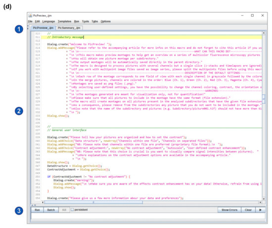 Installation of Fiji and of PicMontage. (a) Structure of the Fiji installation files (downloaded from https://imagej.net/Fiji/Download, last accessed on 6 April 2021). The fiji-win64 directory should be copied to the computer hard drive. To start ImageJ/Fiji, simply open the ImageJ-win64.exe file (highlighted in blue). (b) To install PicPreview and PicSummary as a plugin package (see Option 1 in the main text), create a folder “PicMontage” (highlighted in blue) in the “plugins” directory, paste PicPreview_.ijm and PicSummary_.ijm there and restart ImageJ/Fiji. (c) To run PicPreview and PicSummary as plugins, open the “Plugins” menu (2) from the main window (1) and select PicMontage (PicPreview/PicSummary) (3). Note that this panel reproduces a screenshot of the main ImageJ/Fiji user interface [1,2]. The following figures and panels reproduce screenshots of the different steps of the plugin execution in ImageJ/Fiji. (d) Alternatively, to open PicPreview and PicSummary as macros (see Option B in the main text), simply drag the PicPreview_.ijm and PicSummary_.ijm files in the main ImageJ/Fiji window (labeled 1 in Panel (c)). The macros will open in the text editor as depicted (2). To shift from one macro to the other, select the appropriate tab (1). Press “run” to execute the selected macro (3).