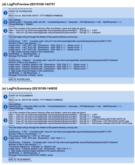 Input and output data for PicPreview and PicSummary. PicPreview and PicSummary were run consecutively and with default parameters on an experimental dataset (Experiment001) containing 2 conditions (1—WT (Wildtype), 2—Mutant) and 3 images per conditions (WT1.tif, WT2.tif, WT3.tif and Mutant1.tif, Mutant2.tif, Mutant3.tif). Note that the plugins and the test dataset are provided as Supplementary Materials (Macro Set “PicMontage” and Dataset “Experiment001”). Image data files are structured with all channels within one file (in this example, each image data file is one .nd2 file with 3 channels). Only the number of channels (“3”), the directory path and the “autoscale” option were edited in the user interface (see Section 3.2). (a) Data file structure. Note that the plugins have to be run on the parent folder “Experiment001,” and the pictures should be saved in subfolders within the parent folder (here, “WT” and “Mutant”). The output files (log files and montages) are saved directly in the parent folder (“Experiment001”). Output files are tagged with a timestamp (YYYYMMDD-HHMMSS) so that log and montage files can be unequivocally paired. (b,c) Montage outputs with PicPreview and PicSummary using standard settings. In both cases, note that the images in the montages are labeled with the channel number, the folder and the file name, in this order. Please also note that the font size of the image labels might vary depending on the picture pixel dimensions. With the advanced settings (see Section 3.3), it is possible to omit these labels. (c) Montage output with PicSummary using standard settings. WT3.nd2 and Mutant1.nd2 were chosen as representative pictures for Wildtype and Mutant, respectively. (d,e) Log files for PicPreview (d) and PicSummary (e). The structure of the log files is similar for both tools. An introductory message (1) includes the macro used and the execution date (timestamp as above). Section (2) records the user inputs and chosen parameters. This is important to record for instance any contrast adjustment that might have been applied to the pictures for the montages. Section (3) lists the content of the parent directory (in this case, Experiment001). Finally, Section (4) lists for each subdirectory the selected image files used for the montage (all images following the user criteria for PicPreview, representative images for PicSummary).