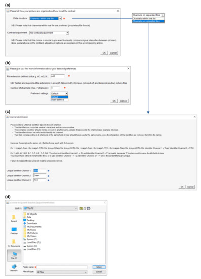 Both macros use a similar user interface and require minimal input from the user. After an introductory message (Figure 3), several windows will open consecutively to ask for basic information on the image dataset. This consists basically of four pieces of information (noted with a red asterisk in Figure 4): (i) the structure (Figure 4a) and (ii) the extension (format) of the image data files (Figure 4b), (iii) the number of acquired channels (e.g., “3” for DAPI/GFP/RFP channels; Figure 4b) and, finally, (iv) the location (path) of the folder containing the experimental data (Figure 4d). The structure of the image data files depends on the saving mode chosen during image acquisition. With most modern microscope software, it is possible to save multichannel images as a single file (data structure = “Channels within one file”), but some more basic programs do not offer this option, and the user saves each channel independently (data structure = “Channels on separated files”). In this last case, the user is also required to enter a meaningful identifier for each channel (see the blue asterisks in Figure 4c). Please consider the identifier requirements (see explanations in Figure 4c) when naming your images. In addition to this basic information, the user interface also proposes multiple options to personalize the output, as described in Section 3.3.