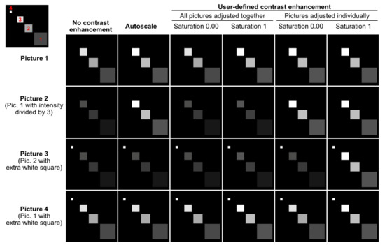 Contrast enhancement pitfalls. This figure represents 4 artificial pictures (rows) after applying different contrast enhancement methods (columns). Each picture contains 3 to 4 squares with different signal intensities (see the top left corner where these squares are numbered in red). The first column represents the raw images. The largest square 1, for instance, has the same mean signal intensity in Pictures 1 and 4 but a 3-fold lower mean intensity in Pictures 2 and 3. In Picture 3, the little square 4 is brighter than any other square. The figure shows how different contrast enhancement methods can make such inter- and intrapicture intensity comparisons fully invalid.