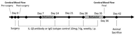 Sham and ACAS surgery mice were randomized to IgG (Isotopic Control) or IL-1β antibody treatment groups; resulting in 4 experimental groups with n = 9 mice/group: sham surgery + IgG, sham surgery + IL-1β antibody, ACAS + IgG, and ACAS + IL-1β antibody. Both IgG and IL-1β antibody were administered at a dose of 10 mg/kg body weight, i.p., weekly, with the first dose given immediately after the sham or ACAS surgery, and the last dose on post-surgery day 35. The experimental protocol is depicted in Figure 1.