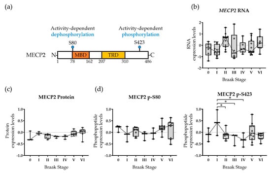 3.1. MECP2 Phosphorylation Is Altered at a Functionally Relevant Phosphorylation Site in the Early Stages of AD-Related Neurofibrillary Pathology in Human Brain
