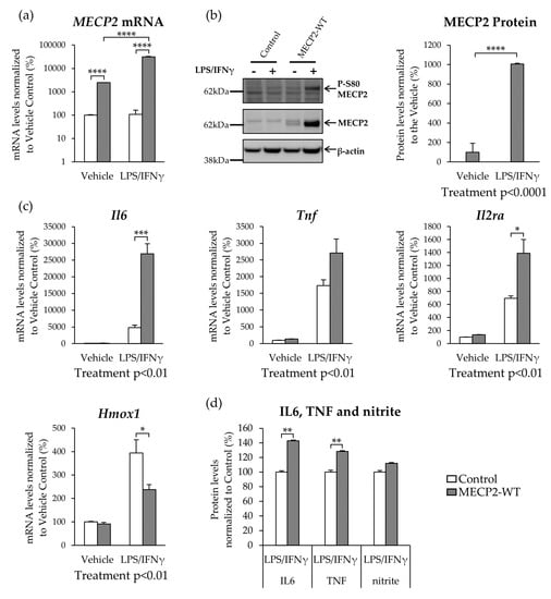 3.2. MECP2 Overexpression Increases the Expression of Pro-Inflammatory Cytokines in BV2 Cells upon LPS/IFNγ-Induced Neuroinflammation