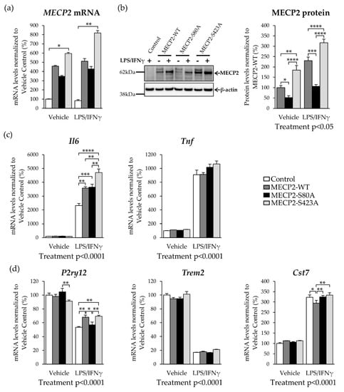 3.3. Overexpression of Phosphorylation-Deficient Variants of MECP2 Increases the Expression of Pro-Inflammatory Cytokines in BV2 Cells upon LPS/IFNγ-Induced Activation