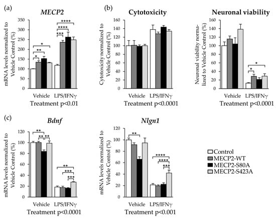 3.5. Expression of MECP2-S423A in Mouse Primary Cortical Neurons Co-Cultured with BV2 Cells Leads to an Increased Expression of Bdnf and Nlgn1 upon LPS/IFNγ-Induced Activation