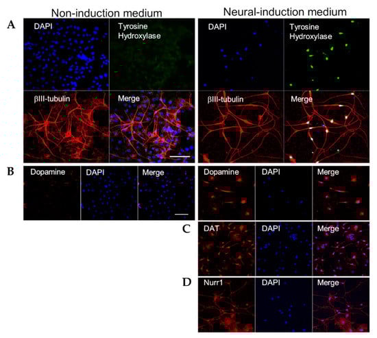 Immunofluorescence staining of differentiated cells was performed as previously reported [2]: The primary antibodies used were anti-βIII-tubulin mouse monoclonal (1:500, MMS-435P, Tuj1 clone, Covance, Princeton, NJ, USA); anti-tyrosine-hydroxylase (TH) rabbit polyclonal (1:100, NB300-109, Novus Biologicals, Centennial, CO, USA); anti-dopamine polyclonal antibody (1:250, IS1005, ImmuSmol, Pessac, France) with a STAINperfect immnostaining kit A (SP A-1000, ImmuSmol); anti-dopamine-transporter (DAT) rabbit monoclonal antibody (1:250, ab184451, Abcam, Cambridge, UK); and anti-Nurr1 rabbit polyclonal (1:50, 10975-2-AP, Proteintech, Rosemont, IL, USA). The secondary antibodies were Alexa Fluor® 568-conjugated goat anti-mouse (1:400, A11004, Molecular Probes, Eugene, OR, USA); Alexa Fluor® 488-conjugated goat anti-rabbit (1:400, A11008, Molecular Probes); and Alexa Fluor® 568-conjugated goat anti-rabbit (1:400, A21069, Molecular Probes). Counterstaining was performed with 4′, 6-diamino-2-phenylindole, dihydrochloride (DAPI) (SE196, DOJINDO, Kumamoto, Japan). Images were collected using an LSM 710 microscope System with ZEN software (Carl Zeiss, Oberkochen, Germany).