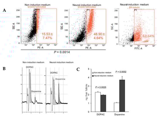 Vibrissa hair follicles from mice were isolated as previously reported [16]: To isolate the vibrissa hair follicles from C57BL/6 mice, the animals were anesthetized with a combination anesthetic of 0.75 mg/kg medetomidine, 4.0 mg/kg midazolam and 5.0 mg/kg butorphanol [17]. Their upper lip containing the vibrissa pad was cut, and the inner surface was exposed. Intact vibrissa hair follicles were dissected under a binocular microscope and plucked from the pad by pulling them gently by the neck with fine forceps. All surgical procedures were performed in a sterile environment. The upper part of vibrissa hair follicles was separated under a binocular microscope. HAP stem cells from the isolated upper part of the vibrissa hair follicle were initially cultured in fresh DMEM (Sigma, St. Louis, MO, USA) containing 10% fetal bovine serum (FBS), 50 µg/mL gentamicin (GIBCO, Grand Island, NY, USA), 2 mM L-glutamine (GIBCO), 10 mM HEPES (MP Biomedicals, Santa Ana, CA, USA) for 7 days [16]. For differentiation to dopaminergic neurons, HAP stem cells growing from the upper part of vibrissa hair follicle were switched to neural-induction medium (STEMdiff Dopaminergic Neuron Differentiation Kit, STEMCELL Technologies, Vancouver, BC, Canada) containing neural-progenitor-cells-induction medium, dopaminergic-neuron-differentiation medium, dopaminergic-neuron-maturation medium-1, and dopaminergic-neuron-maturation medium-2 and cultured according to the instructions of the manufactures (Figure 1). As a control, HAP stem cells were cultured in non-induction medium (10% FBS DMEM). The cells differentiated from HAP stem cells were prepared for immunofluorescence staining, FACS, and for measurement of dopamine secretion.