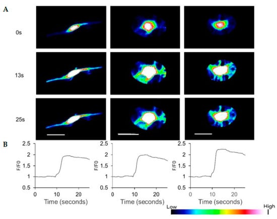HAP stem cells differentiated to dopaminergic neurons increased their Ca2+ levels when treated with 300 μM ATP (Figure 4, Supplementary Materials Video S1).