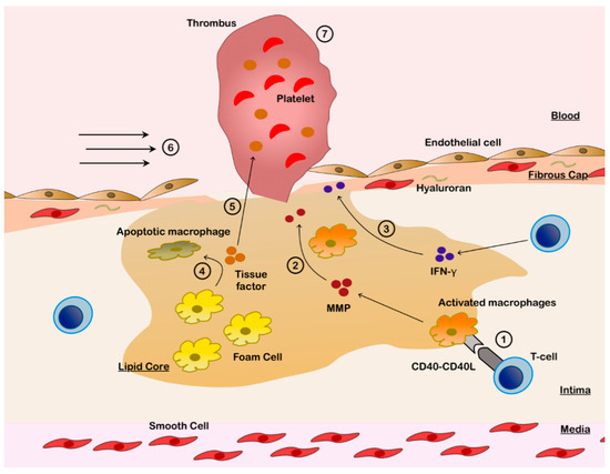 The underling mechanisms that ultimately lead to rupture in the fibrous cap are summarized in Figure 1. During the evolution of atherogenesis, and as macrophages and T-helper 1 cells continue to infiltrate the fibrous cap, most prominently at the shoulder region of the atheroma [23], “cross-talk” occurs between the innate and adaptive immune systems that results in collagen degradation and weakening of the fibrous cap, leading to rupture in some plaques [25]. T cell-derived CD40 ligands bind to CD40 receptors on macrophages to upregulate the generation of MMPs (specifically collagenases MMP-1, MMP-8 and MMP-13) [26,27]. This process is combined with T-helper 1-mediated release of IFN-γ, which inhibits the function of SMCs to repair and maintain the fibrous cap [25,28] and suppresses the SMC proliferation [20].