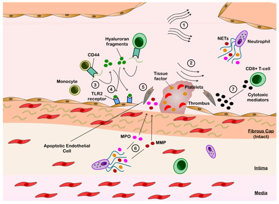 Thus, the available evidence suggests ACS secondary to IFC to be driven by a two-hit mechanism—initial endothelial injury due to low shear forces amplified by TLR2-mediated activity and subsequent neutrophil and CD8+ T cell recruitment to enhance endothelial damage [39]. Exposure of the hyaluronan-rich fibrous cap results in rapidly progressing overlying thrombosis and subsequent ACS.