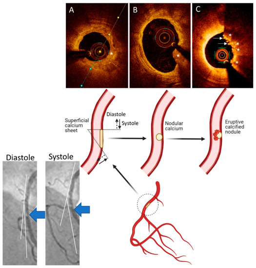 A Working Hypothesis for Formation of Eruptive Calcified Nodules. Superficial calcified sheets (asterisk) (A) located in the arterial segments with hinge movement, e.g., in the mid segment of the right coronary artery (large blue arrows on the angiographic pictures and inset), are subject to cyclic mechanical forces during systole and diastole, which could weaken and fragment the sheets of calcium, thus resulting in protruding nodular calcium (asterisk) (B) that is surrounded by fibrin. These nodules eventually erupt through the plaque surface ((C), asterisks), causing disruption in the intima, with superimposition of thrombus ((C), arrows). Parts of the figure are adapted from Lee et al. [55] with permission.