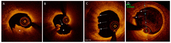 OCT-defined RFC is characterized by the presence of a thrombus rich in red blood cells (the “red thrombus”) in association with a disrupted fibrous cap that overlies a lipid-rich core with or without cavity formation (Figure 4) [88]. The thrombus appears as a protruding mass within the lumen, causing backscattering of the infrared spectrum emitted by OCT, thus casting a shadow behind the red thrombus. In contrast to a red thrombus, a “white thrombus” is defined as a predominantly platelet-rich thrombus, which generally causes low signal attenuation and is most frequently detected in culprit lesions with IFC (Figure 4).