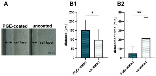 Conditions for cell sheet formation such as required cell numbers depend on cell type []. A total of 5–8 × 105 cruciate ligamentocytes per cm2 were at least required to allow stable cell sheet formation. After 24 h cell attachment and growth phase, the ligamentocytes at the margin of the 12-well started to detach spontaneously; thereby, a cell-free border developed (Figure 1A). The interspace between the wall of the 12-well and the cell layer was measured. This distance was significantly larger in cell culture plates with PGE coating (152.4 ± 47.7 µm) compared to the uncoated plates (99.5 ± 56.1 µm) after 24 h (Figure 1B1). Hence, there were also occasional difficulties in releasing an intact ligamentocyte sheet from the uncoated plates. The sheets harvested from the uncoated plates were more fragile, sometimes having tears or being tattered.