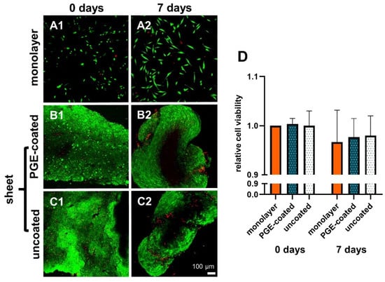 The relative viability of the sheets did not decrease significantly after detachment (day 0) and 7 d of culturing. There was no significant difference in viability in the sheets compared to the respective monolayer. In addition, it was shown that PGE coating did not change the cell viability of sheets in comparison to the uncoated 12-well plates (Figure 2A1–D).