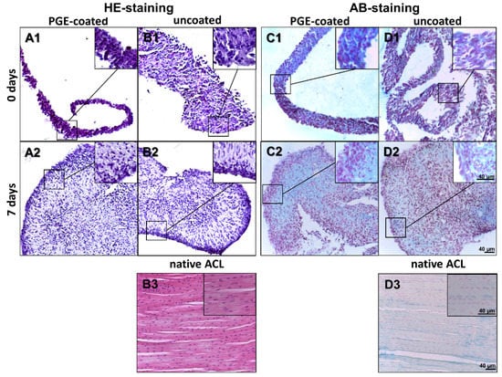 The ligamentocyte sheets harvested from both types of plates were investigated using HE staining to gain an overview of tissue structure. AB staining was performed to estimate sulphated glycosaminoglycan (sGAG) deposition. Observation at the timepoint immediately after detachment (day 0) revealed a high cell density with many densely packed cell nuclei and some ECM. Detached ligamentocyte sheets showed a random and dense cell arrangement with no differences between sheets from uncoated and coated surfaces (Figure 3A1–D1). However, after 7 d the cell nuclei in inner regions of the sheets were localized with a larger distance between each other and a larger amount of ECM became visible between the cells (Figure 3A1–D1 vs. Figure 3A2–D2). HE-stained cross-sections of isolated ligamentocyte sheets showed that the detached sheets were already more than 4 cell diameters thick. At 7 d the folds of the sheets had more or less fused, forming a 3D construct, still with irregular cell arrangement. This was different from the cell arrangement in rows normally detectable in the native ACL of the rabbit by HE and AB staining (Figure 3B3–D3). AB staining of the ligamentocyte sheets revealed a faint blue staining in the ECM between cells, which proved sGAG deposition already at day 0 but also later at day 7 (Figure 3C1,D1,C2,D2). sGAG deposition in sheets produced on PGE-coated and uncoated surfaces was generally weak resembling the faint staining observed in the native ACLs (Figure 3C2,D2,D3).