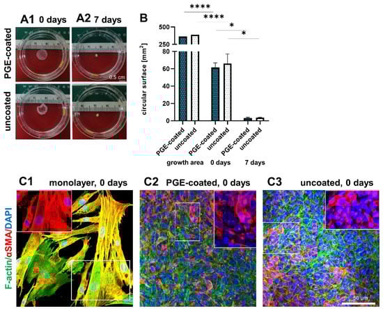 After detachment, the surface of the ligamentocyte sheets was significantly smaller (61.6 ± 4.3 mm2 with PGE coating vs. 66.1 ± 9.0 mm2 without coating) than the original growth area of the 12-well plates (manufacturer information for the surface of the 12 wells: 365 mm2 with PGE coating and 390 mm2 without coating) and it significantly further decreased (3.1 ± 0.8 mm2 with PGE coating vs. 3.6 ± 0.5 mm2 without coating) during the following 7-d cultivation period. At the end of the observation period the cell sheets formed a 3D construct (Figure 4A,B). F-actin stress fibers and αSMA were visualized in the monolayer and ligamentocyte sheets freshly released from the PGE-coated and uncoated plates (Figure 4C1–C3). The structure of the actin cytoskeleton was depicted to try to explain the shrinkage after sheet detachment. The expression of F-actin and αSMA did not show major differences in the sheets harvested from the PGE-coated and uncoated plates. F-actin revealed a net-like overall structure in the sheets consisting of densely packed cells (Figure 4C2,C3).
