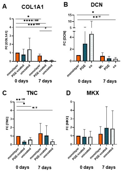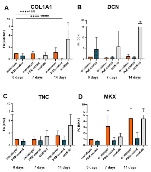 Relative gene expression of COL1A1 decreased significantly in cell sheets (manufactured on surfaces with PGE coating) and cultured for 7 and 14 d compared to the monolayer at 0 d (Figure 7A). However, the relative gene expression of COL1A1, DCN, TNC and MKX tended to be upregulated in scaffolds colonized by cell sheets in comparison to cell sheets alone (Figure 7A–D) and that of COL1A1, DCN and TNC was also higher in comparison to the monolayer at day 14 (Figure 7A–C).