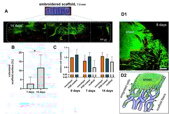 Ligamentocyte viability and colonized scaffold surface area of ligamentocytes emigrated from ligamentocyte sheets on a P(LA-CL)/PLA scaffold prepared with PGE-coated dishes after 7 and 14 d. (A) Colonization of the scaffold by ligamentocytes is shown (14 d, a half of the scaffold is shown). Green: vital, red: dead cells. B) Colonized scaffold surface after 7 and 14 d. Comparison of cell viability in monolayer, isolated cell sheets released from poly(glycidyl ether) (PGE)-coated plates and colonized scaffolds, n = 3 independent experiments with ligamentocytes of three different donors. (C) Relative ligamentocyte viability, n = 4 independent experiments with ligamentocytes of four different donors. ((D1) Cells emigrating from a cell sheet onto P(LA-CL)/PLA scaffolds after 8 days at higher magnification (red line = border of the sheet) and (D2) a scheme of cell emigration from a sheet on scaffold fibers. (A) Scale bar: 200 µm. Statistic: (B) One sample t-test, two-tailed (comparison with day 0 monolayer), paired one-way ANOVA (comparison between the groups). (C) One sample t-test, two-tailed (*), p values: * <0.05.