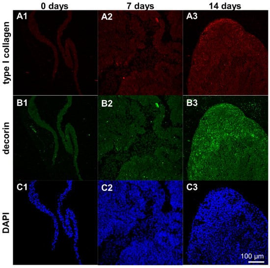 Protein expression of type I collagen and decorin by ligamentocyte sheets released from PGE-coated surfaces after detachment (0 d) and when cultured for 7 or 14 d. Type I collagen is depicted in red (A1–A3), decorin in green (B1–B3). Ligamentocyte nuclei were counterstained in blue using 4’,6-diamidino-2-phenylindole (DAPI) (C1–C3). A view on the sheet is shown by confocal laser scanning microscopy. Scale bar: 100 µm (A1–C3).