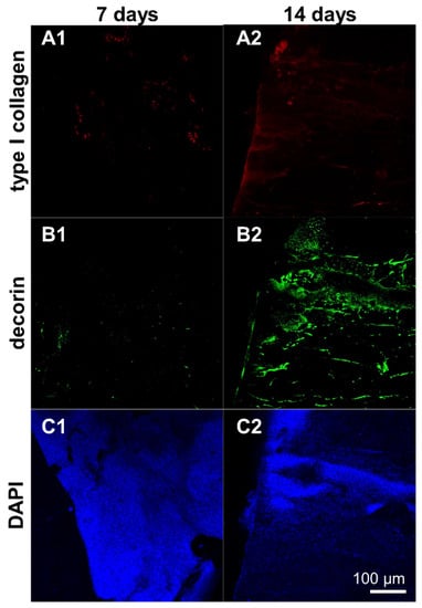 Protein expression of type I collagen and decorin by ligamentocyte sheets released from PGE-coated surfaces and seeded on embroidered scaffolds for 7 or 14 d. Type I collagen is depicted in red (A1,A2), decorin in green (B1,B2). Ligamentocyte nuclei were counterstained in blue using 4’,6-diamidino-2-phenylindole (DAPI) (C1,C2). A view on the sheet is shown by confocal laser scanning microscopy. Scale bar: 100 µm (A1–C2).