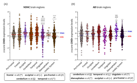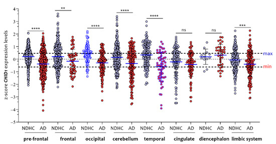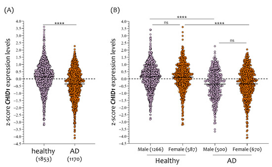 In analyzing the CHID1 expression levels in the eight brain regions in NDHC subjects and AD patients, we highlighted a significant difference only in NDHC subjects’ limbic system region, in which males had significantly lower levels than females (p < 0.0001) (Figure S1A). No significant difference between the sexes was observed in the different brain regions of AD patients (Figure S1B).
