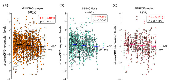 There was a moderate inverse correlation between CHID1 brain expression levels in NDHC and age (r = −0.1050, p < 0.0001) (Figure 2A). A significant inverse correlation in CHID1 brain expression levels has been observed in both males (r = −1051, p = 0.0002) (Figure 2B) and females (r = −1019, p = 0.0135) (Figure 2C) of NDHC subjects.
