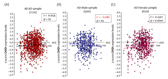The correlation analysis between CHID1 expression levels and age in the brains of AD patients showed conflicting results (Figure 3). Brain expression of CHID1 did not correlate with age in AD patients (r = 0.050, p = ns) (Figure 3A). In AD male patients, we observed the same trend for all samples (r = 0.082, p = ns) (Figure 3B), while in females, a positive correlation with age was highlighted (r = 0.1501, p < 0.00001) (Figure 3C).