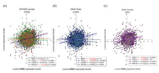 When we analyzed the 585 NDHC female brain samples, we demonstrated that CHID1 expression levels correlated both to CALB1 (r = 0.3135, p < 0.0001) and to NRGN (r = 0.2237, p < 0.0001), but not to CD31 (r = −0.009, p = ns) (Figure 4B). Contrary to data highlighted in the brains of NDHC males, CHID1 expression was negatively correlated with IBA1 in females (r = −0.097, p = 0.0184) (Figure 4C).