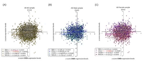Correlation analysis between CHID1 brain expression levels and neurological markers in AD patients. Analysis of correlation between the CHID1, IBA1, CD31, CALB1, and NRGN expression levels in all brains (1170) (A), and in brains sorted in 500 males (B) and 670 females (C), belonging to AD patients. Data in the figure are indicated as z-score intensity expression levels and presented graphically as dot plots. p values < 0.05 were considered to be statistically significant.