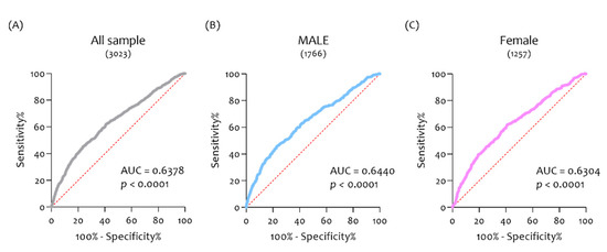 In order to evaluate the potential diagnostic ability of CHID1 to discriminate the AD patients from NDHC subjects, we performed a receiver operating characteristic (ROC) analysis. We showed that CHID1 express a fair diagnostic ability to discriminate the AD from NDHC (AUC = 0.6368, p < 0.0001) (Figure 8A). This ability was maintained for both males (AUC = 0.6440, p < 0.0001) (Figure 8B) and females (AUC = 0.6304, p < 0.0001) (Figure 8C).