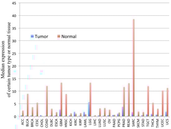 The PYGM gene expression profile across tumor samples and corresponding normal tissues. The height of the bar represents the median expression of a certain tumor type (blue) or normal tissue (red). ACC—adrenocortical carcinoma, BLCA—bladder urothelial carcinoma, BRCA—breast invasive carcinoma, CESC—cervical squamous cell carcinoma and endocervical adenocarcinoma, CHOL—cholangiocarcinoma, COAD—colon adenocarcinoma, DLBC—lymphoid neoplasm diffuse large b-cell lymphoma, ESCA—esophageal carcinoma, GBM—glioblastoma multiforme, HNSC—head and neck squamous cell carcinoma, KICH—kidney chromophobe, KIRC—kidney renal clear cell carcinoma, KIRP—kidney renal papillary cell carcinoma, LAML—acute myeloid leukemia, LGG—brain lower grade glioma, LIHC—liver hepatocellular carcinoma, LUAD—lung adenocarcinoma, LUSC—lung squamous cell carcinoma, MESO—mesothelioma, OV—ovarian serous cystadenocarcinoma, PAAD—pancreatic adenocarcinoma, PCPG—pheochromocytoma and paraganglioma, PRAD—prostate adenocarcinoma, READ—rectum adenocarcinoma, SARC—sarcoma, SKCM—skin cutaneous melanoma, STAD—stomach adenocarcinoma, TGCT—testicular germ cell tumors, THCA—thyroid carcinoma, THYM—thymoma, UCEC—uterine corpus endometrial carcinoma, UCS—uterine carcinosarcoma, UVM—uveal melanoma. According to the Gene Expression Profiling Interactive Analysis, GEPIA, on-line tool www.gepia.cancer (accessed on 4 February 2021) [].