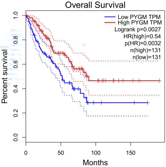 Overall survival rate of patients with sarcoma, depending on the PYGM gene expression rate. Low (median) PYGM expression correlated with poorer survival. Normalized RNA-sequencing data as transcripts per million (TPM). HR—hazard ratio calculated using Cox PH Model. The solid line represents the survival curve and the dotted line represents the 95% confidence interval. According to the Gene Expression Profiling Interactive Analysis, GEPIA, available online www.gepia.cancer (accessed on 4 February 2021) [].