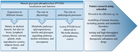The zebrafish also has a great potential to become a useful model in research regarding PYGM functions in physiological and pathological biological processes. There are two homologous genes encoding muscle glycogen phosphorylase: pygma and pygmb. However, both zebrafish genes and proteins show great similarity to the human ones (85.0% amino acid sequence identity and 76.1% nucleotide sequence identity). The research results show that morpholino knockdown of pygma and pygmb in zebrafish leads to similar symptoms to those observed in McArdle patients. The pygma and pygmb knockdown resulted in a reduced Pygm level in zebrafish morphants, which exhibited changes in morphology, such as altered, disintegrated muscle structure, and accumulation of glycogen granules in the subsarcolemmal region []. The symptoms also include a reduction of mobility and swimming speed (data not published).