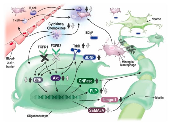 - Kamali, S.; Rajendran, R.; Stadelmann, C.; Karnati, S.; Rajendran, V.; Giraldo-Velasquez, M.; Berghoff, M. Oligodendro-cyte-specific deletion of FGFR2 ameliorates MOG(35–55) -induced EAE through ERK and Akt signalling. Brain Pathol 2021, 31, 297–311. [Google Scholar] [CrossRef] [PubMed]