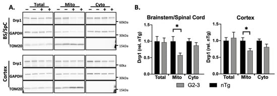 We isolated crude mitochondrial and cytosolic fractions (Figure S2), as previously described [7], from endstage TgA53TG2-3 mice [5,40] and analyzed the Drp1 levels in the total homogenate, crude mitochondrial fraction, and cytosolic fraction. The enrichment of the mitochondria and cytosol was determined by evaluating TOM20 (translocase of outer membrane subunit 20) for the mitochondrial fraction (Mito), and examining GAPDH (glyceraldehyde 3-phopshate dehydrogenase) for the total and the cytosolic fraction (Cyto). The results indicated that the mitochondrial fractions from the brainstems and spinal cords (BS/SpC, pooled) of TgA53TG2-3 mice (+) contained reduced levels of Drp1, normalized to TOM20, compared to the levels in the BS/SpC from their nTg (−) litter mates (Figure 1A,B). The cytosolic levels of Drp1 were not different between the TgA53TG2-3 mice and their nTg littermates (Figure 1B).