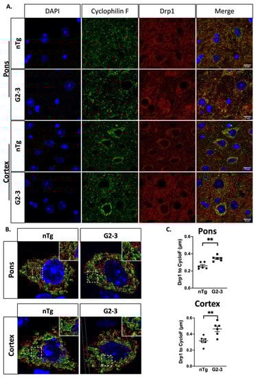 Previously, we showed reduced Drp1 localization in the mitochondria in the pontine neurons of endstage TgA53TG2-3 mice [12]. We extended our analysis by evaluating Drp1 localization with the mitochondria at the cellular level in both the cortical and pontine neurons. We performed an immunofluorescence staining of the Drp1 and the mitochondria (Cyclophilin F) (Figure 2A) using a z-level reconstruction of the confocal images (Figure 2B) obtained. By analyzing z-stacked images for mitochondrial (Cyclophilin F) and Drp1 signals using the MatLab Imaris software, we were able to approximate the mean minimal distance of each Drp1 signal to the closest mitochondrion, which appeared as punctate dots within a selected region of interest (ROI). The results (Figure 2C) show that the raw distances between Drp1 and the mitochondria were increased in both the pontine and cortical neurons of the TgA53TG2-3 mice (G2-3) compared to the neurons of nTg controls.