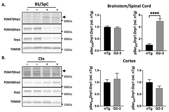Phosphorylation pattern of Drp1 in brain areas with αS pathology is altered to favor reduced mitochondrial fission. (A,B) Immunoblot analysis of mitochondrial fractions from nTg control (−) and TgA53TG2-3 (+, G2-3) mice for phosphorylated Drp1. Location of the pSer637Drp1 band was identified using N2A cell lysate. Quantification of immunoblots with phosphorylated Drp1 normalized to the total mitochondrial Drp1. (A) In the pons, compared to the nTg samples, the G2-3 samples showed increased levels of pSer637Drp1 (p < 0.0001). (B) In the cortex, there is no change in pDrp1 levels compared to the nTg samples using an unpaired t-test with Welch’s correction (n = 6 per group, mean ± SEM). (**** p < 0.0001).