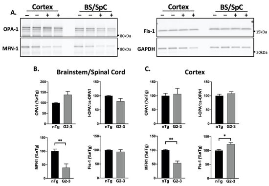 A previous report showed reduced MFN1 and MFN2 in the SpC of another TgA53T mouse model [27]. Our analyses show that the levels of MFN1 were significantly reduced in both the Ctx and BS/SpC of the TgA53TG2-3 subjects (Figure 4A–C). While we did not evaluate MFN2, based on a prior study we predict that it was also reduced.
