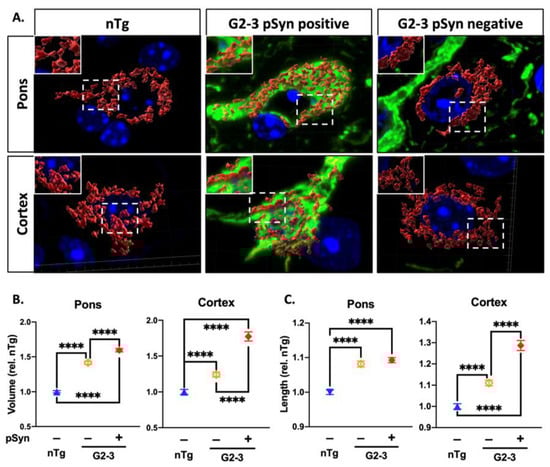 The findings above indicate that both the expression of A53T-mutant αS and αS pathology could impact mitochondrial morphology. To determine how the reciprocal changes in the proteins involved in mitochondrial dynamics are reflected in mitochondrial morphology in presence or absence of αS pathology, we evaluated the overall volume and length of the mitochondria as a function of αS pathology. First, we confirmed that human αS was widely expressed by the transgenic neurons using an antibody that bound selectively to total human αSyn (hSyn) [52] (Figure S4). Consistent with previous findings, hSyn was widely expressed by neurons in both the pons and the cortex of the TgA53TG2-3 mice, but not in the nTg mice [5]. Furthermore, hSyn localization was consistent with enrichment at the presynaptic terminals, with a subset of the neurons showing strong somato-dendritic staining. The somato-dendritic hSyn immunoreactivity represents αS pathology because hSyn immunoreactivity is colocalized with anti-phosphoSer129αSyn (pSyn) staining (Figure S4). As previously described [5], based on the anti-pSyn staining, neurons containing αS pathologies were abundant in the pons, while only an occasional neuron exhibited αS pathology in the cortex.