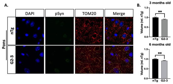 No mitochondrial enlargement is found in the pons of presymptomatic mice. (A) Representative confocal images of pSyn and mitochondria (TOM20) in three-month-old control and TgA53TG2-3 mice. Scale bar: 10 µm. (B) Quantification of mean mitochondrial and neuronal somas of 3- and 6-month-old mice shows mildly decreased mitochondrial volume by about 10% (3m.o.: p = 0.001; 6m.o.: p = 0.0019). SEM are displayed (SEM/SD: 3m.o.: nTg = 0.02267/0.7828, G2-3 = 0.02134/0.7483; 6m.o.: nTg = 0.02198/0.7703, G2-3 = 0.01825/0.6907), based on unpaired t-tests with Welch’s correction. (n = 3 per genotype). (** p ≤ 0.01)
