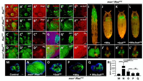 Loss of msn collaborates with RasV12 to inactivate Hippo pathway. (A–H) Fluorescence micrographs of GFP-labeled clones of eye discs are shown. Compared with RasV12 clones, msn−/−/RasV12 tumors show dramatic upregulation of Diap1 (B–B”), ex-lacZ (D–D”), Wg (F–F”), and mammalian homologue YAP/TAZ (Yki) localization (H–H”). (I–L) Fluorescence micrographs of GFP-labeled pupa/larva and cephalic complexes are shown. msn−/−/RasV12-induced tumor growth phenotype is completely suppressed by mammalian homologue Lats 1/2 (Wts) overexpression with or without JNK blocking. (M–R) Ectopic Wts overexpression causes stronger suppression of msn−/−/RasV12 tumor growth phenotype than that of JNK inhibition alone (M–Q). Quantification of GFP-positive area of indicated genotypes (R). **** p < 0.0001(mean + S.D.). Scale bars represent 50 μm (A–F), 20 μm (G,H), 500 μm (I–L), 200 μm (I’–L’), 100 μm (M–Q).