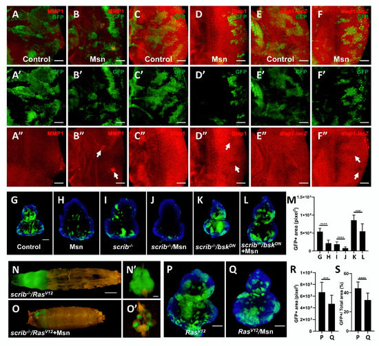 Previous studies indicated that Msn can functionally substitute for Hippo to restrict Yki activity in intestine [29,30,31]. Consistent with this notion that Msn is a positive regulator of Hippo pathway, we found Msn overexpression alone caused clone undergrowth (Figure 3G,H,M) and significantly reduced endogenous expression of Yki reporter Diap1 (Figure 3C,D and Figure S3G,H) and diap1-lacZ (Figure 3E,F and Figure S3I,J) in Drosophila imaginal discs, whereas it had no obvious changes on apoptosis and mitosis (Figure S3A–D). In Drosophila, cell polarity gene scribble (scrib) acts as a neoplastic tumor suppressor and would be eliminated by Hippo-mediated cell competition [35,36]. We found that Msn overexpression caused a further reduction of scrib−/− clone sizes (Figure 3I,J,M). It has been proven that the elimination of scrib−/− clone depends on JNK-activation-induced Yki inhibition, and given that Msn overexpression can activate both JNK and Hippo signaling (Figure 3A,B), we blocked JNK activity and simultaneously overexpressed Msn in scrib−/− clones. We found that the overgrowth phenotype of scrib−/−/bskDN clone (Figure 3K) was significantly reduced by co-expression of Msn (Figure 3L,M), indicating that Msn promotes scrib−/− elimination in a JNK-independent manner. In accordance with this, we also found that Msn overexpression significantly suppressed RasV12/scrib−/−-induced tumor overgrowth (Figure 3N,O and Figure S3E,F), which has been proven to be mediated by Hippo signaling [37,38,39]. Moreover, we found that Msn overexpression reduced both the relative and absolute clone sizes of RasV12 (Figure 3P–S). Together, these results indicate that ectopic Msn overexpression activates Hippo signaling to suppress tumorigenesis.
