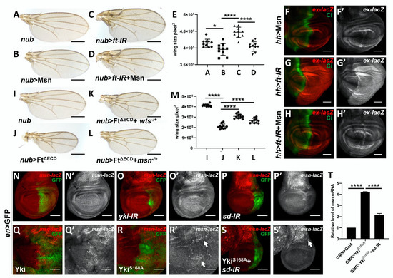 Msn acts downstream of protocadherin Fat (Ft) in modulating Hippo signaling. (A–E) Light micrographs of Drosophila adult wings. Compared with control (A), Msn overexpression significantly impedes ft knockdown-induced overgrowth phenotype (C and D); note that overexpression of Msn alone mildly reduces wing size (B). (E) Quantification of wing size in (A–D). (F–H and F’–H’) Fluorescence micrographs of wing discs are shown. Msn overexpression does not significantly affect ex transcription under hh-Gal4 (F and F’), but significantly suppresses ft knockdown-induced ex upregulation (G–G’ and H–H’). (I–L) Light micrographs of Drosophila adult wings are shown. Removing one copy of wts (K) or msn−/+ (L) significantly impedes nub > FtΔECD-induced wing undergrowth phenotype (J). (M) Quantification of wing size in (I–L). (N–S) Fluorescence micrographs of wing discs are shown. Compared with control (N and N’), knockdown yki or sd reduce endogenous msn transcription (O,P and O’,P’); Yki or YkiS168A overexpression upregulates msn transcription (Q–R’), which is suppressed by knocking down sd (S). (T) Quantification of relative level of msn mRNA of indicated genotypes. * p < 0.05 (mean + S.D.); **** p < 0.0001 (mean + S.D.). Scale bars represent 200 μm (A–D and I–L), 100 μm (F–H, N–S, and N’–S’).