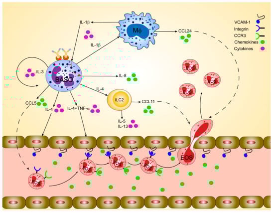 Basophils and eosinophils are present at sites of allergic inflammation in the airways and skin [4,16,17,18,19,20,21]. Namely, increased numbers of basophils are reported in the lung tissues of fatal asthmatics [16], in sputum and bronchoalveolar lavage (BAL) fluid from asthmatics after allergen challenge [4,20]. Interestingly, upon allergen challenge, the increase in basophil percentages in BAL fluids negatively correlate with basophil percentages in the blood, indicating the recruitment of basophils from the circulation into the lung [20]. The presence of basophil infiltrates in atopic allergic inflammation in human skin was established using basophil granule-specific monoclonal antibody (mAb) [18]. In an extension of this observation, Ying and co-workers demonstrated, besides basophils, eosinophils infiltrate 6 h after allergen challenge in late-phase reaction [22]. Consistently, concomitant recruitment of basophils and eosinophils is reported in the skin lesions of eosinophilic pustular folliculitis and atopic dermatitis [21,23]. In asthma, elevated levels of eosinophil count and their mediator, MBP in BAL fluid from asthmatics are also reported [24]. A comparative study between basophils and eosinophils in atopic asthmatics identifies their presence in bronchial biopsies, and their numbers are further enhanced after allergen challenge in the late-phase of asthmatic and skin reactions [17]. Similarly, an increase in numbers of both airway basophils and eosinophils in atopic asthmatics’ sputum after allergen inhalation challenge is observed [19]. Interestingly, it has been demonstrated that eosinophil-derived MBP directly activates the release of histamine and LTC4 from human basophils [15,25]. Consistent with this observation, in several experimental allergy models, basophils and eosinophils appear to be closely linked by directly influencing each other or indirectly due to being responsive to similar cytokines and chemokines [7,8,26]. Therefore, it is reasonable that basophils and eosinophils interact with each other at sites of allergic inflammation. In 1995, Thomas et al. reviewed the potential functional network between basophils and eosinophils [27]. New findings in recent years give some more insights into the mechanisms of interaction between these two types of granulocytes. Eosinophils are increased in allergic inflammation and are often considered the main actors of the late phase of allergic rashes. However, although present at low numbers, basophils seem to be pivotal for allergic inflammation progression and maintenance. We will summarize whether and how basophils can regulate the function of eosinophils in allergic dermatitis and asthma.