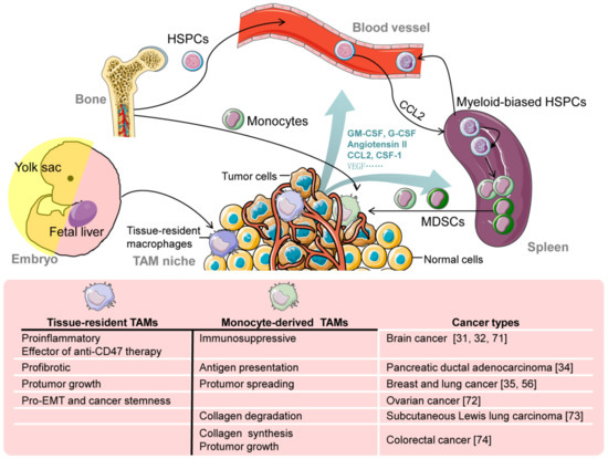 - TAMs predominantly derive from circulating monocytes with bone marrow hematopoietic stem cell (HSC) origin. This concept was not questioned until the embryonic origin of tissue-resident macrophages (TRMs) was discovered.